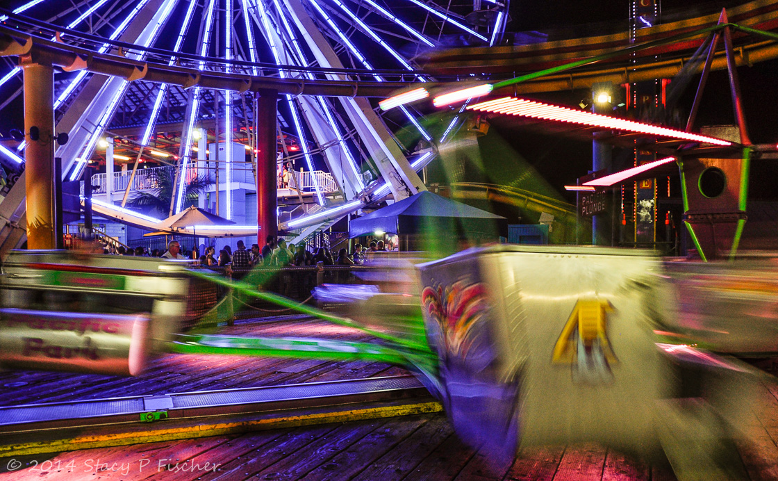 Because it was nighttime and I did not have a tripod, I had my work cut out for me. I managed to brace my camera on top of railings and planters and whatever else I could find, but with the wind off the ocean, the vibrations on the pier from the rides themselves, and a camera lens that is not very fast, camera shake was inevitable. All of these shots were taken with a Nikon D90 with an 18-200 mm f/3.5-5.6 lens.