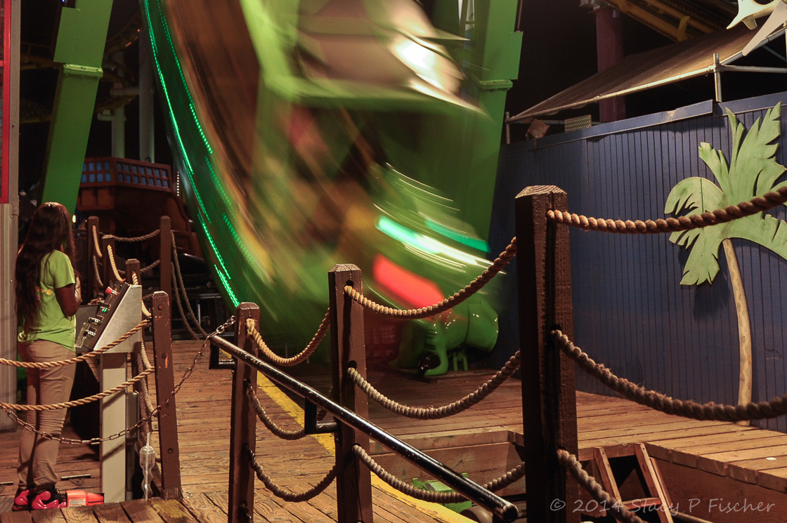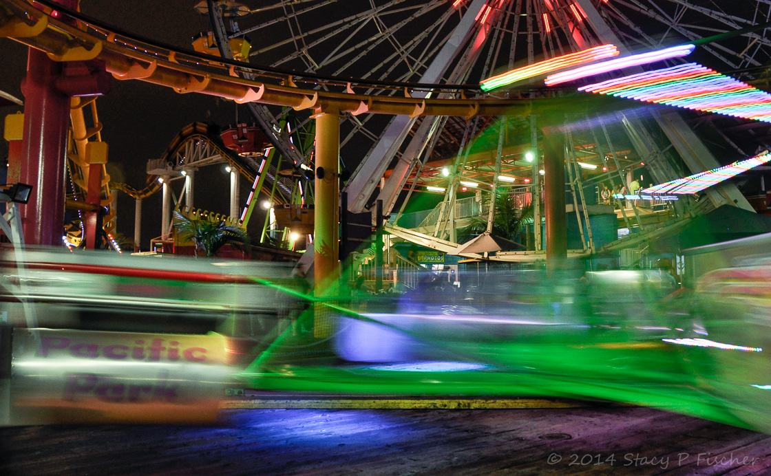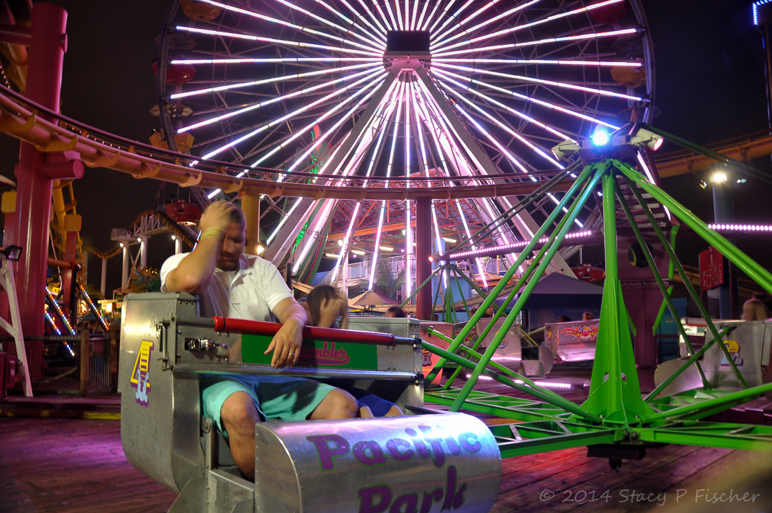 The night wasn’t all about watching others test their courage – my daughter and I braved the West Coaster, billed as the only West Coast, oceanfront, steel roller coaster located on a Pier over the Pacific Coastline; the Pacific Plunge, a 150-foot tall tower ride that lifts riders up in a 5-seat gondola and drops them to the bottom; and the Pacific Wheel, the world’s only solar-powered Ferris Wheel. We also took our own turn on Inkie’s Scrambler. As this ride powered up, I had my camera on my lap and happily began pressing the shutter to see what I could get. The logistics were a bit iffy, given that my daughter and I were being slammed into each other. But amidst our movement and our belly laughter, I ended up with one pretty good shot.
