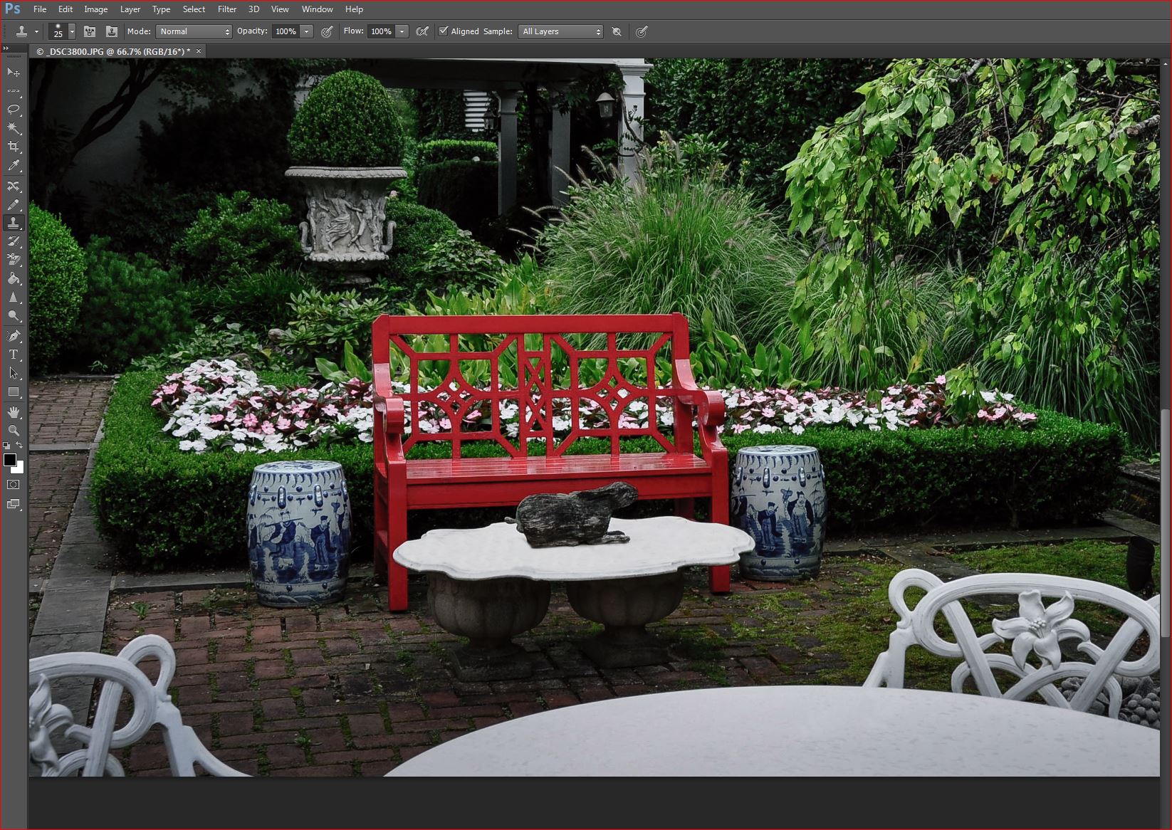 Inn at Little Washington Garden PS Clone Stamp Published August 28, 2014 at 1646 × 1166 in After-Before Friday Week 15 ← Previous Next → 7. Exported into Photoshop and used Clone Stamp to clean up dirty water on table in front of red bench.