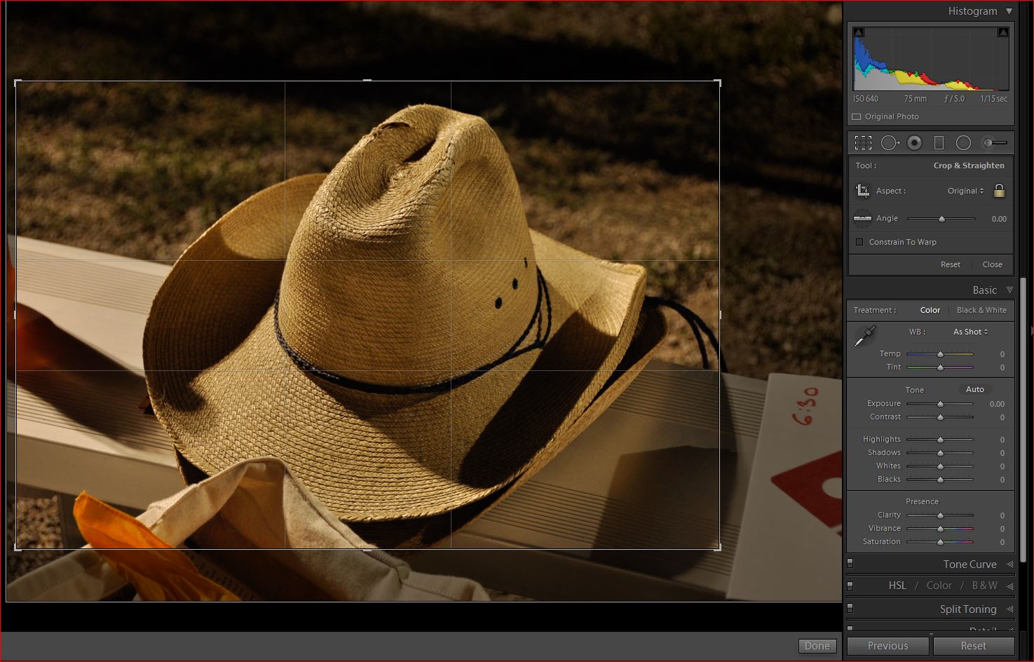 2. Cowboy Hat (Crop) Published September 4, 2014 at 1475 × 944 in After-Before Friday Week 16 ← Previous Next → Image imported into Lightroom and crop overlay applied to remove pizza box and center focus on the hat.