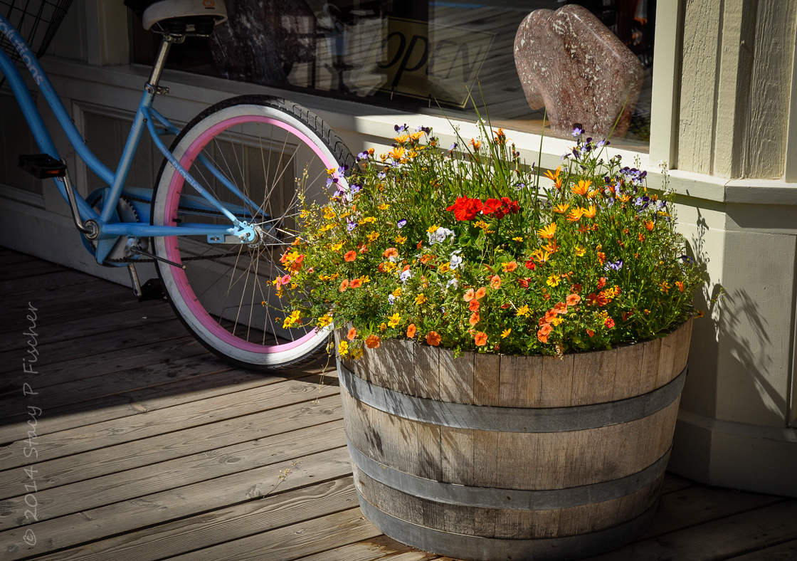 I can just imagine the warmth on my face standing on this sidewalk. I love the way the light hits the beautiful flowers. I love the bike parked on the sidewalk and the open sign which makes me want to go in the shop! Perfect photo for warmth ๐