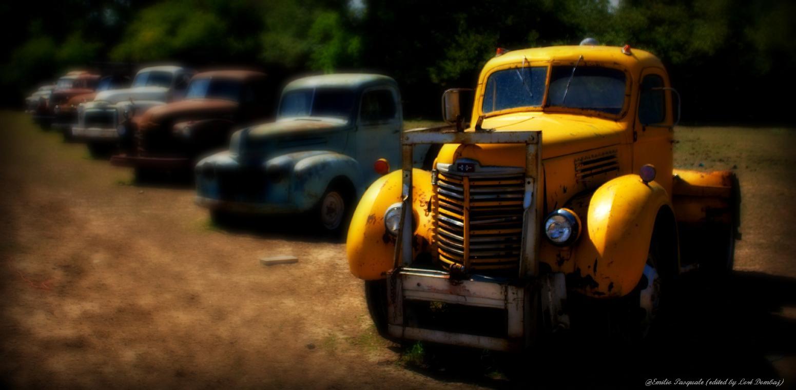 Karen says: Thanks Emilio for sharing with us such a fantastic image of vintage trucks for us to work on. I just bought a new book, my first on Lightroom and actually read through it as I edited the picture. Mostly in Lightroom I stepped through the right-side panels and tried out a few different settings which enhance the color, hue and saturation plus a few others. Hopefully not overdone. Next, the image was cropped and straightened a slight bit. In Photoshop I used the bandaid to remove the rope/hose from the right side and to take a few spots out of the yellow truck window. Lastly, in Photoshop the patch tool was used to remove a couple of rocks and the piece of wood. This was a fun learning image for me and can’t wait to see how everyone else approached it. Thanks, Stacy, for all your hard work to get this off the ground. I really enjoyed working on Emilio’s image.