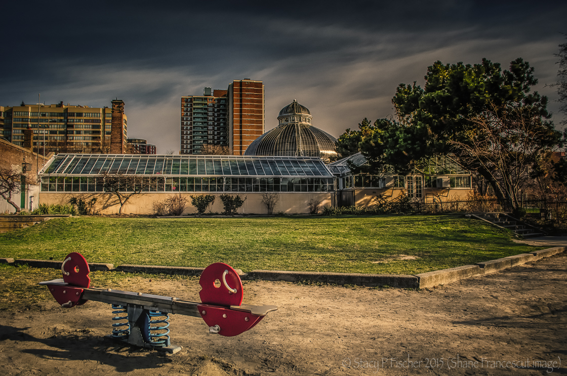 I began in LR 5, applying a preset called La Dolce Vita. I then exported the image into Color Efex Pro, where I added a total of seven different filters. Back in LR 5, I applied four radial filters to bring detail and focus to the greenhouse/domed roof and the teeter-totter. Along the way, I tweaked temperature, exposure, and clarity. You can see some of these changes in the gallery, below.