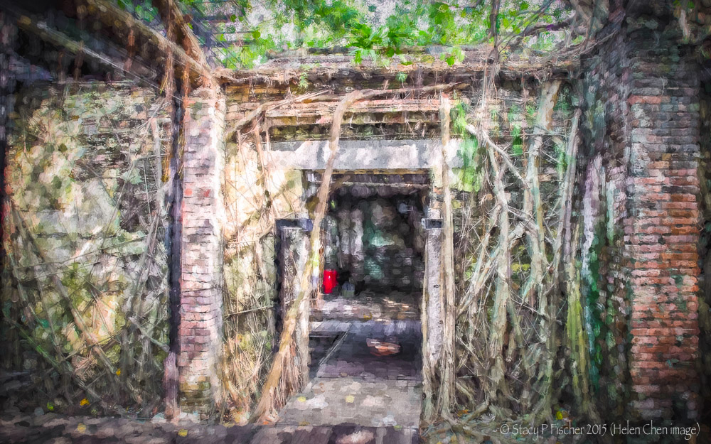 Chris says: With all the lines and deep shadows, Helen’s image was a challenge to work with. I decided to crop the photo into a portrait, focusing on the aerial roots of the banyan tree on the right, and to emphasize the passage of time by giving the image an aged look. For details of what I did, check out my post here.
