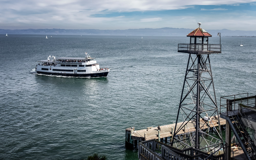 Looking down from the road’s second switchback to the Dock Tower and an approaching Alcatraz ferry.