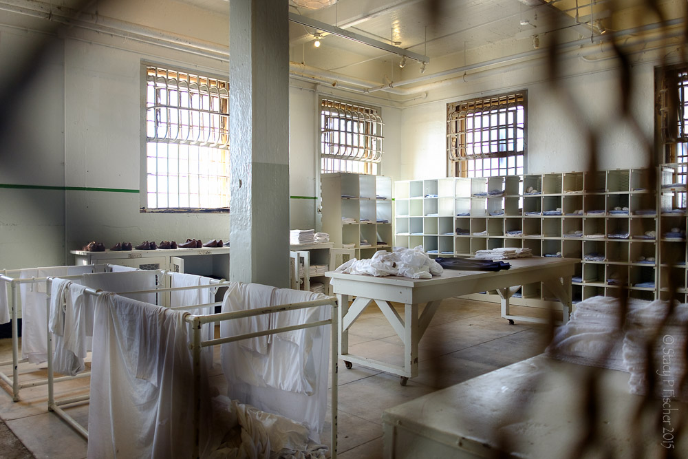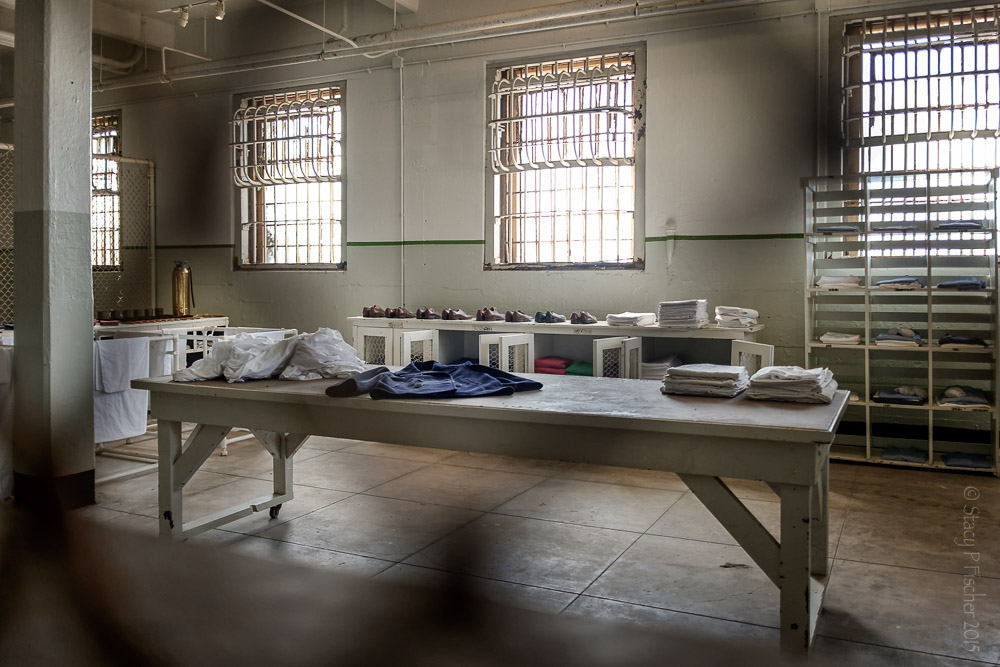 Clothing Issue is at the west end of the shower room. Here, inmates would turn in their soiled clothing for clean clothing.